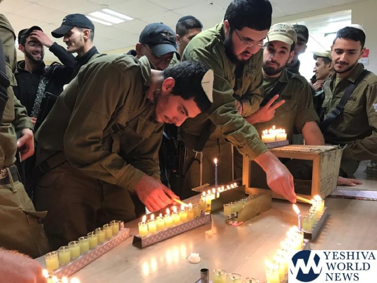 (PHOTOS IN EXTENDED ARTICLE) Chareidi soldiers from the Israel Air Force’s ‘Palgat HaNegev’ unit light their menorahs on Chanukah in their base in the south of the country. The official
