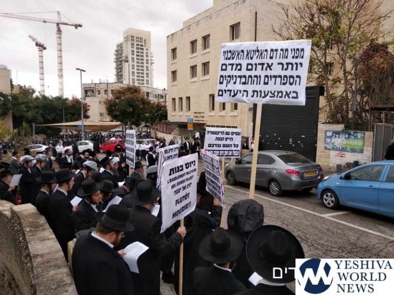 Chareidim protested outside the Jerusalem Induction Center on Thursday afternoon against the drafting of frum woman and against the discrimination against Sephardim. The signs question if the blood of Sephardim