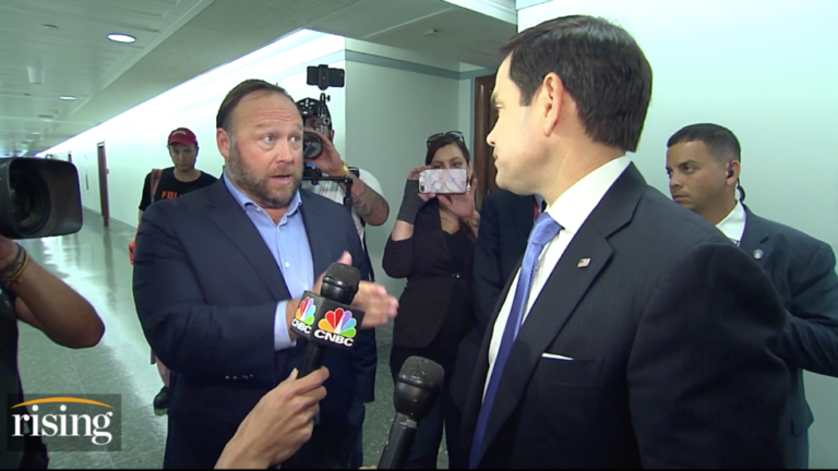 Right-wing conspiracy theorist Alex Jones became a sideshow outside two congressional hearings Wednesday, insulting Florida Sen. Marco Rubio as a “little punk” and heckling a reporter, all while posting the