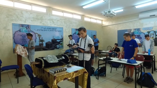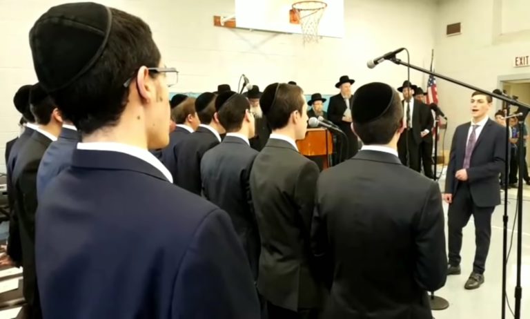 Talmidim of the Philadelphia Yeshiva say the ‘Pledge of Allegiance’ and the National Anthem before their graduation ceremony Philadelphia Yeshiva is led by Hagaon HaRav Shmuel Kamenetzky Shlita, one of
