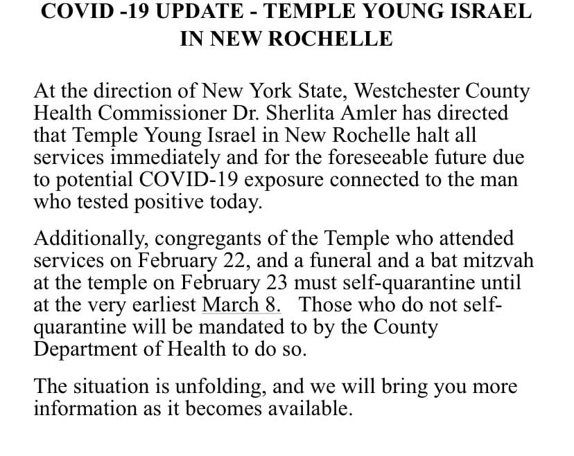 Meanwhile, the Young Israel of New Rochelle has been ordered to halt all Minyanim at the Shul.