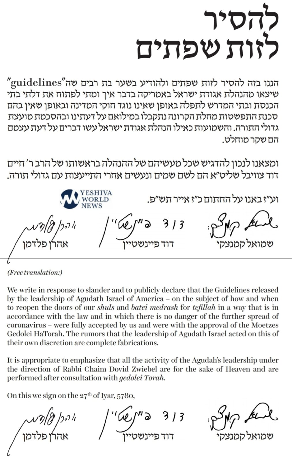 We write in response to slander and to publicly declare that the Guidelines released by the leadership of Agudath Israel of America – on the subject of how and when to reopen the doors of our shuls and batei medrash for tefillah in a way that is in accordance with the law and in which there is no danger of the further spread of coronavirus – were fully accepted by us and were with the approval of the Moetzes Gedolei HaTorah. The rumors that the leadership of Agudath Israel acted on this of their own discretion are complete fabrications.