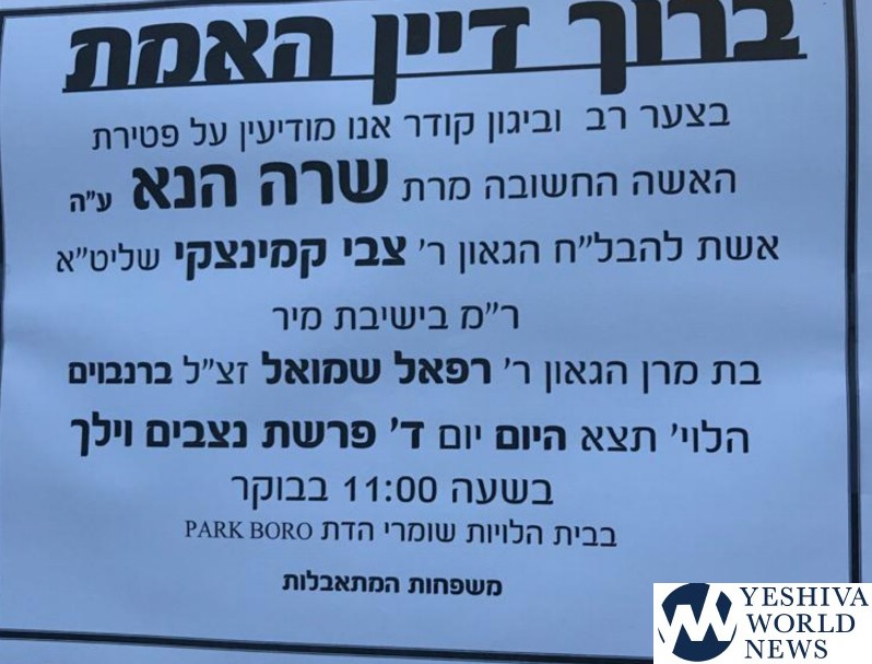 YWN regrets to inform you of the Petira of Rebbetzin Hani Kaminsky ע”ה, the wife of HaRrav Herschel Kaminsky, Magid Shiur in Mirrer Yeshiva in Flatbush, and daughter of the late Mirrer Rosh Yeshiva, Hagaon HaRav Shmuel Berenbaum ZATZAL.