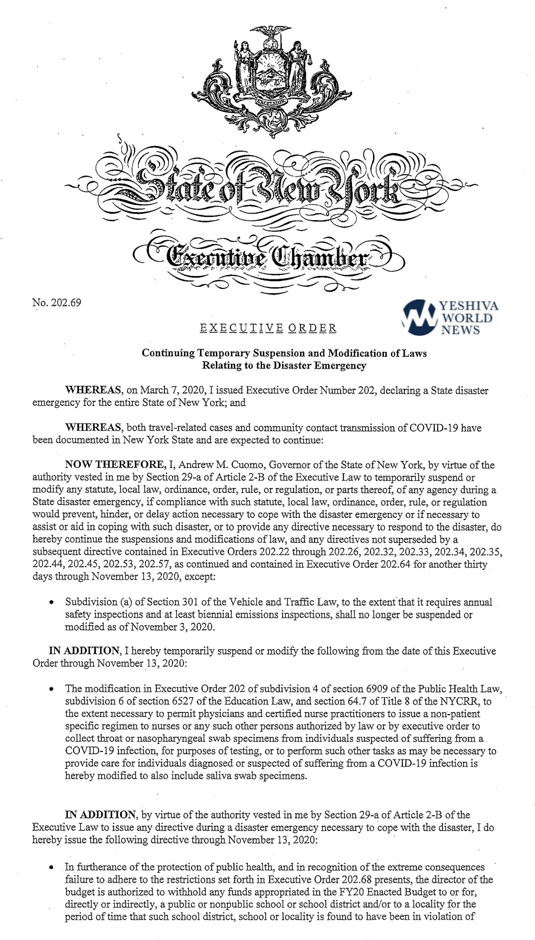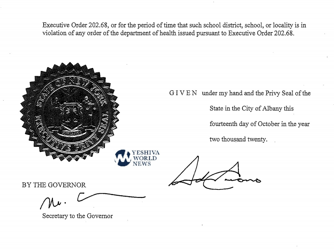 As he promised to do, NY Governor Cuomo signed a new “Executive Order” to withhold funds from private schools (Yeshivas) that are open in COVID-19 “Red Zones”.