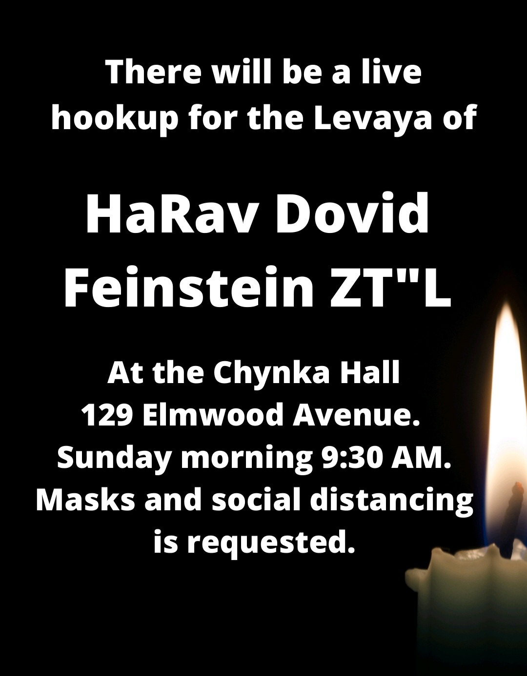 MOTZEI SHABBOS UPDATE: The Levaya of Hagaon HaRav David Feinstien ZATZAL will be at 9:30AM Sunday morning outside of Mesivta Tiferes Yerushalayim at 145 East Broadway New York, NY.
