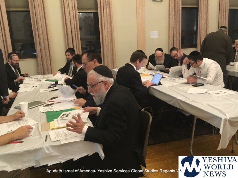 NY State Yeshiva HS Principals and Teachers Work in Groups at a hands-on Workshop on the new Global Studies Regents Examination sponsored by Agudath Israel Yeshiva Services. The event was held on Thursday, Dec. 7 at Prospect Park Bnos Leah High School.