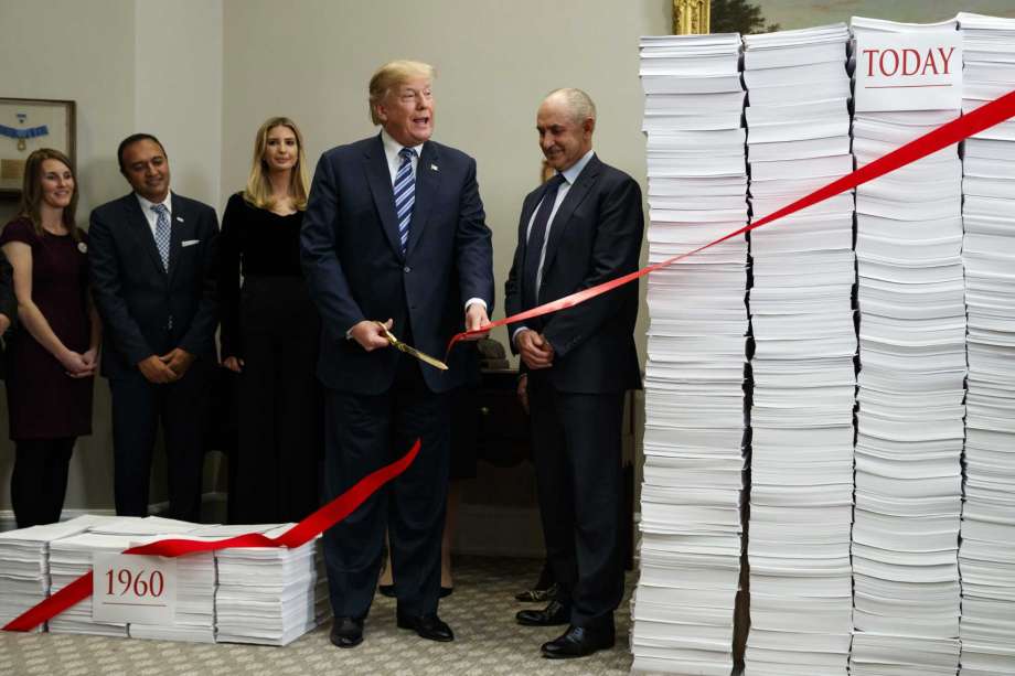 “For many decades, an ever-growing maze of regulations, rules, restrictions has cost our country trillions and trillions of dollars, millions of jobs, countless American factories, and devastated many industries,” Trump said Thursday, flanked by giant stacks of paper he said represented regulations that have stifled economic growth.