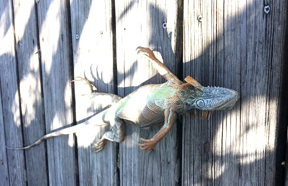 Palm Beach Post columnist Frank Cerabino tweeted a photograph of an iguana lying belly-up next to his swimming pool. WPEC-TV posted images of an iguana on its back on a Palm Beach County road.