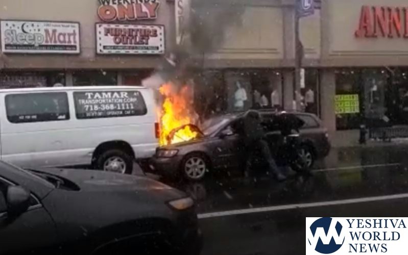 For reasons unknown, the elderly man gripped the steering wheel with all his strength, and refused to let go and exit the burning vehicle. The Hatzolah member radioed for backup and assistance, and a passerby stopped to help as the street full of people stood in shock. The vehicle was on fire, and they were unable to break the mans grip from the steering wheel. The Hatzolah member risked his life multiple times as he was literally inside the burning vehicle to try and break the mans grip from the wheel.