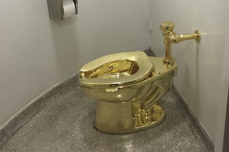 She emailed the White House Office of the Curator in September to say that the Trumps could borrow the toilet installation used by visitors in a museum restroom until mid-September. The 18-karat toilet , titled “America,” is Maurizio Cattelan’s jab at the nation’s greedier instincts. It has an estimated value topping $1 million.