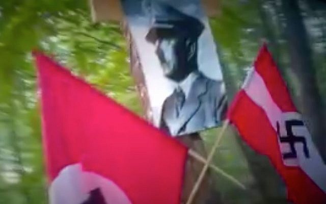 Mostly young men, they raised a toast to Hitler, whose photo also hung from a tree, praising him and making the stiff-armed “Sieg Heil” salute as a large wooden swastika burned. The ceremony included a birthday cake decorated with a swastika.