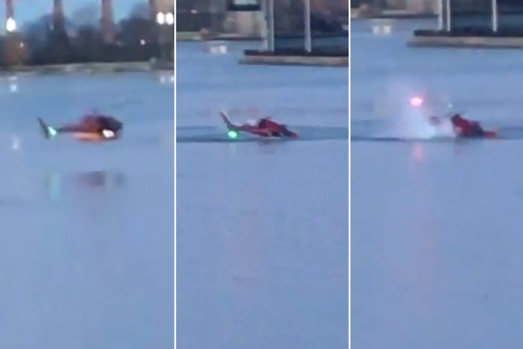 Video taken by a bystander and posted on Twitter shows the red helicopter land hard in the water and then capsize, its rotors slapping at the water.