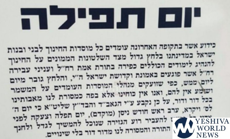 Dayanim in London are calling for a Yom Tefilla this Thursday, Yom Kippur Koton due to the government becoming involved in the education system.