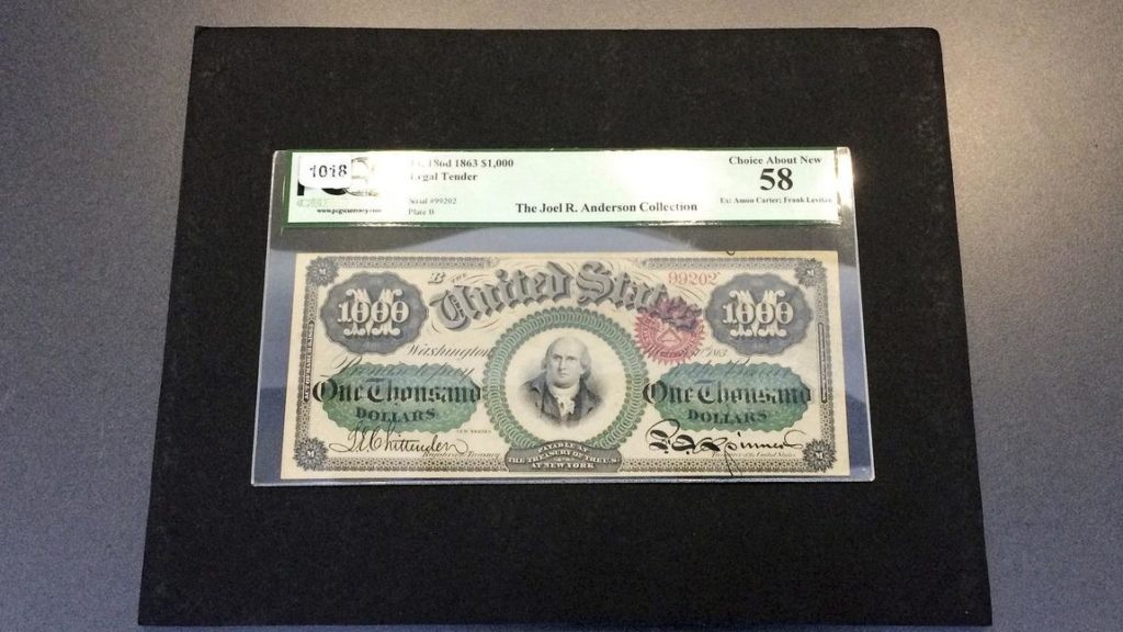 Stack’s Bowers Galleries says the bill is one of only two of its kind available to collectors. The U.S. Treasury Department says thousand-dollar bills haven’t been printed in the U.S. since 1945. U.S. founding father Robert Morris of Pennsylvania is pictured on the bill.