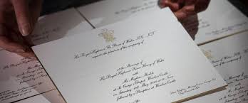 The invitations, which are beveled and gilded along the edges, feature Prince Charles’ three-feather badge embossed in gold. They feature italic writing on thick white card, and are issued under the name of Charles, father of the groom.