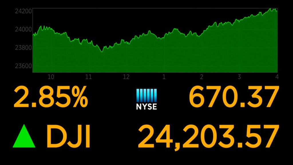 The Standard & Poor’s 500 index rose 70.29 points, or 2.7 percent, to 2,658.55. The Dow Jones industrial average gained 669.40 points, or 2.8 percent, to 24,202.60. The Dow lost more than 1,400 points last week and is still down slightly for the year.