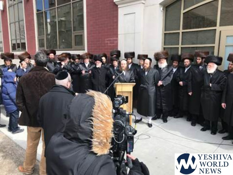 Dozens of yeshiva graduates and parents of yeshiva students gathered outside of the Satmar Girls School in Williamsburg to speak out against the unrelenting attacks against their schools by anti-yeshiva activists and declare their right to choose the best education for their children.