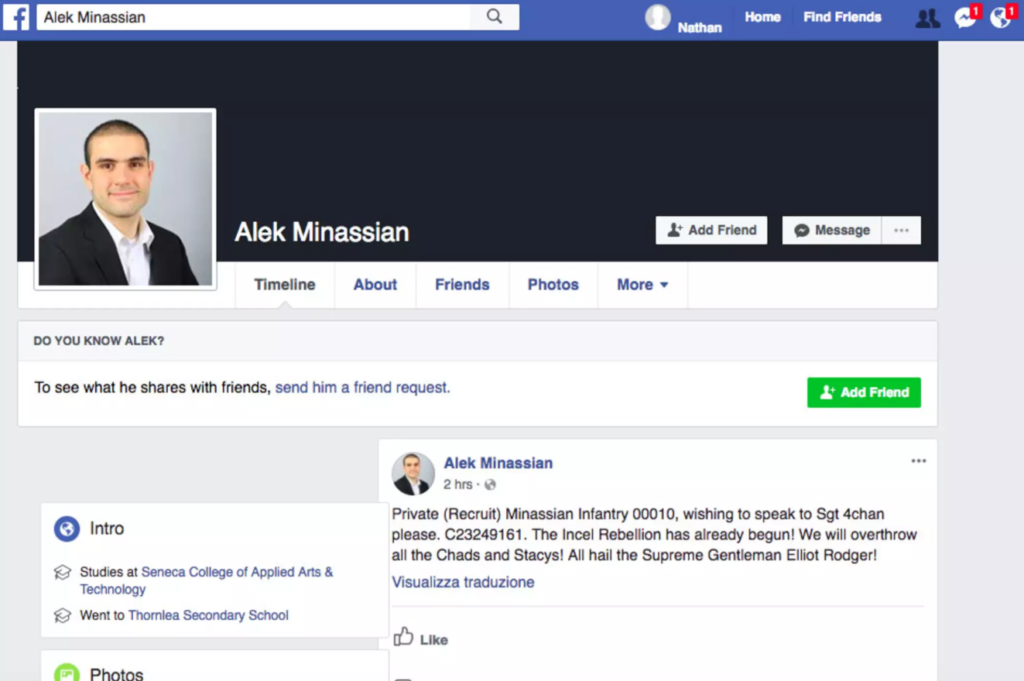 The gender issue arose because of what police called a “cryptic” Facebook message posted by Minassian just before the incident that suggested he was part of an online community angry over their inability to form relationships with women.