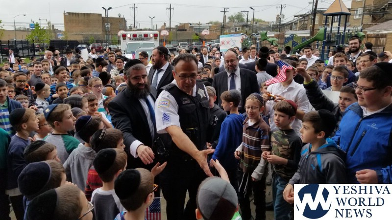 The steady torrent of rain came to a sudden halt this past Monday morning at precisely 10:55. It was at exactly that very moment that over 450 young boys from Yeshiva Tiferes Tzvi in Chicago had planned to line up outside, in their school yard, to pay tribute to retiring police officer, Sergeant Mark George, for his decades of service to the community.