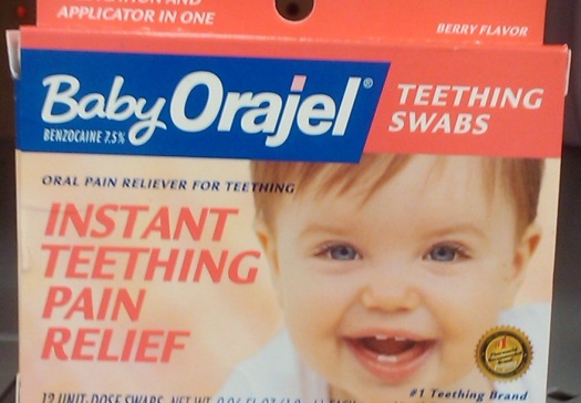 Teething products with benzocaine include Baby Orajel. The packaging states: “Instant relief for teething pain.” It is made by the New Jersey-based Church and Dwight Co. Inc.; a company representative could not be immediately reached for comment Wednesday morning.