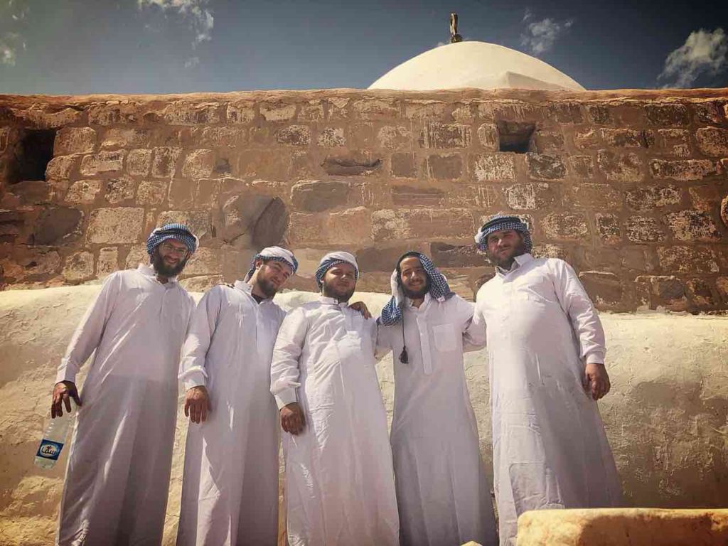 A group of Chassidim, dressed as locals, made the precarious journey to be Mispallel at Aharon HaKohen’s Kever, located on Har HaHar in Petra, Jordan.