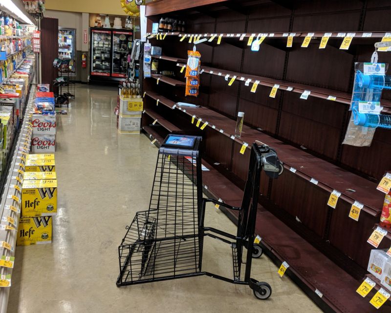 Within hours of the first alert, residents stripped the aisles at one supermarket in the city’s downtown center of bottled water, and a shopping cart lay tipped on its side in front of the empty shelves. Workers brought out a pallet of sparkling water, which they placed at the front of the store, and told customers they hoped they’d get more regular water in the morning.
