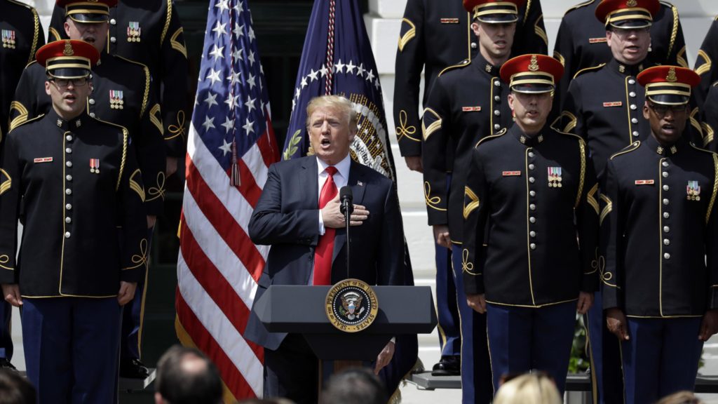 Trump’s own patriotic event was not without its controversy. Following the playing of the anthem, a heckler shouted from the audience: “Stop hiding behind the armed services and the national anthem!” prompting boos. A Swedish reporter posted video of a man kneeling as the anthem was played.