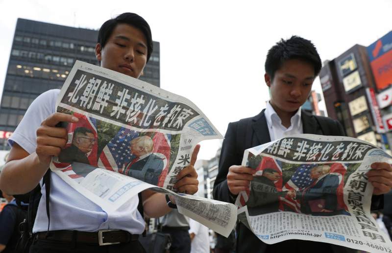 People look at the extra edition of Japanese newspaper Mainichi Shimbun reporting the summit between U.S. President Donald Trump and North Korean leader Kim Jong Un