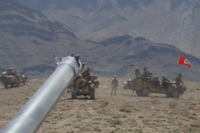 Australian Broadcasting Corp. published the photograph of the red flag with a black swastika inside a white circle flying from a Land Rover Long Range Patrol Vehicle somewhere in Afghanistan in 2007.