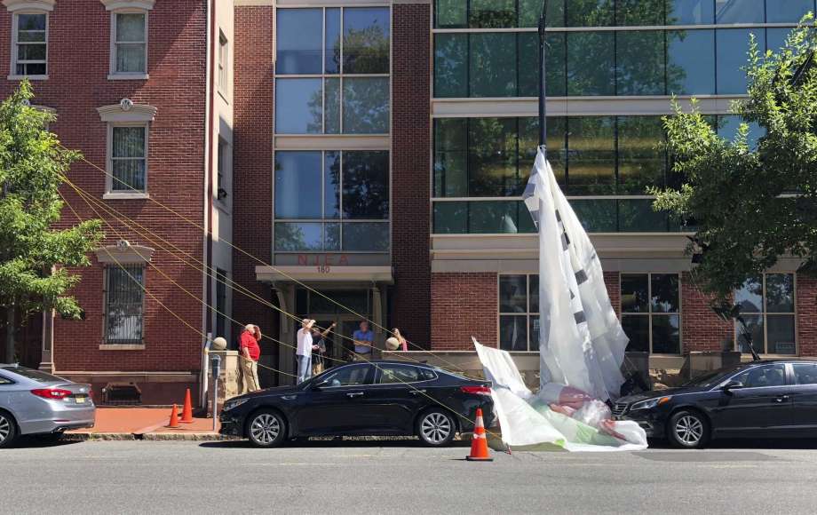 An airplane-towed banner broke loose and came down near New Jersey’s statehouse, fluttering to the ground and shattering the rear windshield of a parked car.