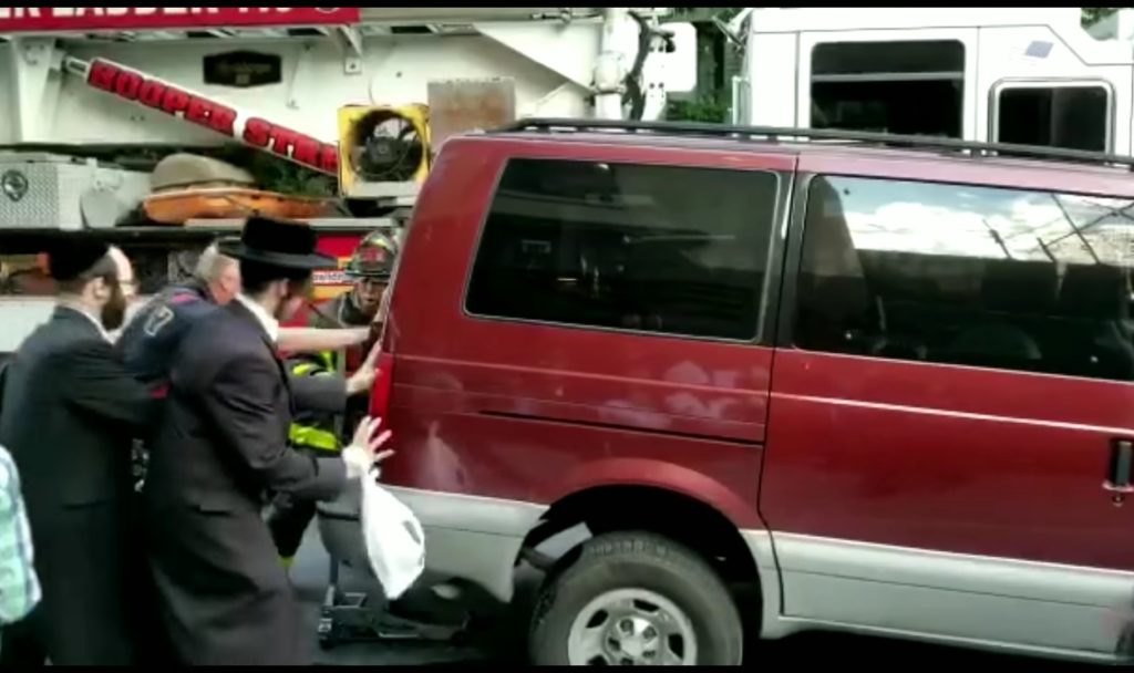 Local Hasidic residents helped FDNY firefighters move a vehicle at the scene of a fire in Williamsburg on Friday afternoon.