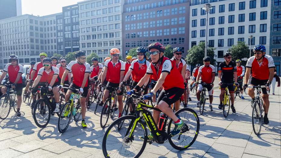 As Sunday’s ride started, the cyclists gathered for a safety briefing and the Jewish prayer for travelers. The British ambassador and German government representatives gathered to see them off.