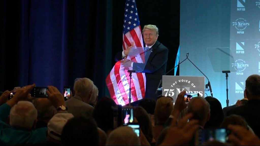 Following a speech where President Donald Trump said he would detain family units together, instead of separating the children, the leader hugged an American Flag positioned on the stage.