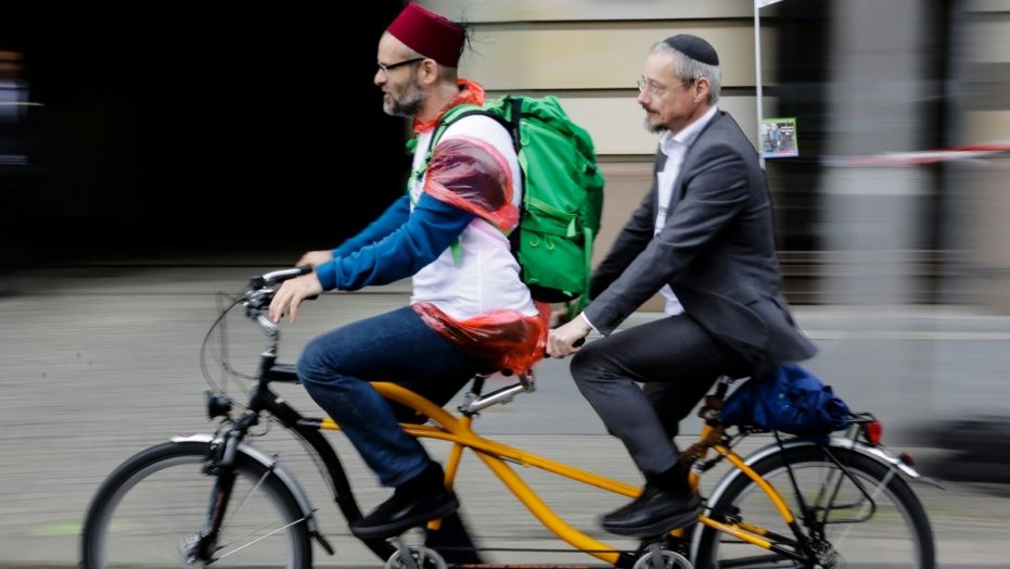 Some 25 Jews and Muslims rode tandem bicycles through the German capital on Sunday in a protest against growing anti-Semitism and attacks on Muslims in the country.