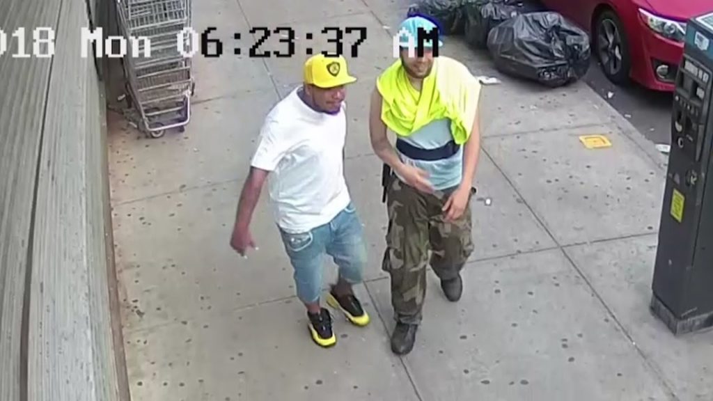 Surveillance video aired by WCBS shows the victim being approached by two men in a Bronx intersection on June 18.