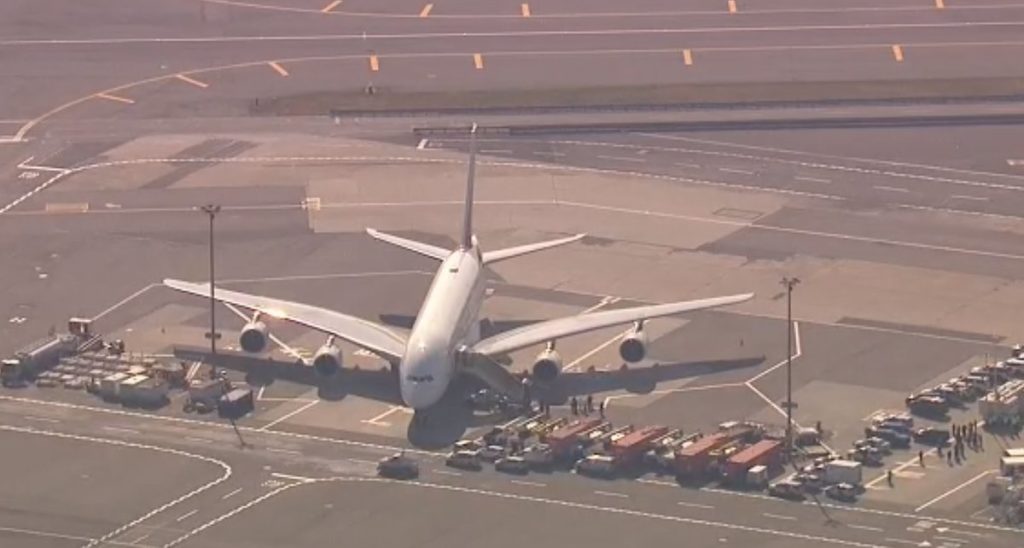 Video from news helicopters showed the jet sitting on the tarmac surrounded by ambulances, emergency vehicles and airport personnel. After several minutes, passengers began to emerge. Those who were cleared were put on buses to get to the terminal.