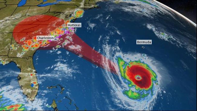 At 8 p.m., the storm was centered 725 miles (1,165 km) southeast of Cape Fear, North Carolina, moving at 17 mph (28 kph). It was a potentially catastrophic Category 4 storm but was expected to keep drawing energy from the warm water and intensify to near Category 5, which means winds of 157 mph (253 kph) or higher.