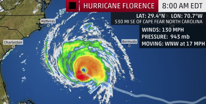 At 8 a.m., Florence had top sustained winds of 130 mph (215 kph) and was centered 530 miles (855 kilometers) southeast of Cape Fear, North Carolina, approaching the coast at 17 mph (28 kph). Already a potentially catastrophic Category 4 hurricane, it was moving over warmer water and expected to intensify to near Category 5, which means winds of 157 mph (253 kph) or higher.