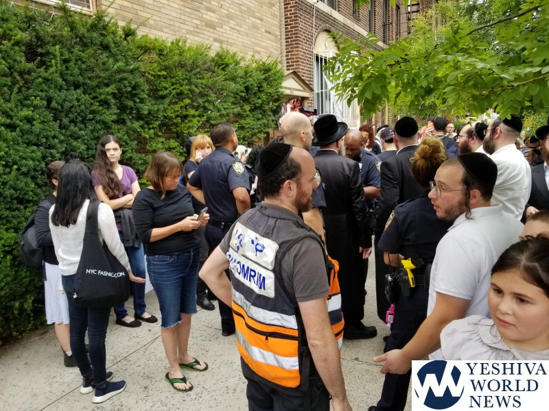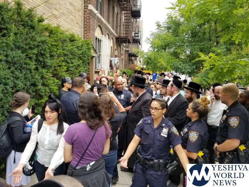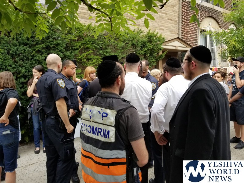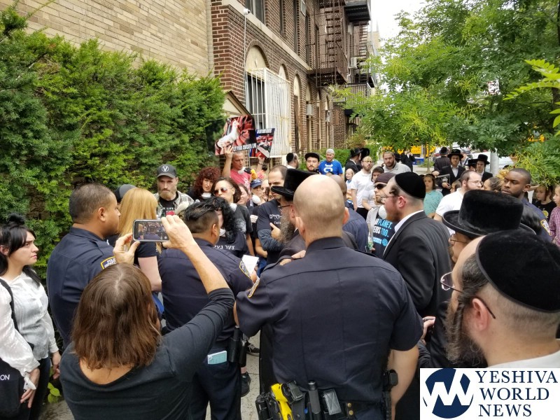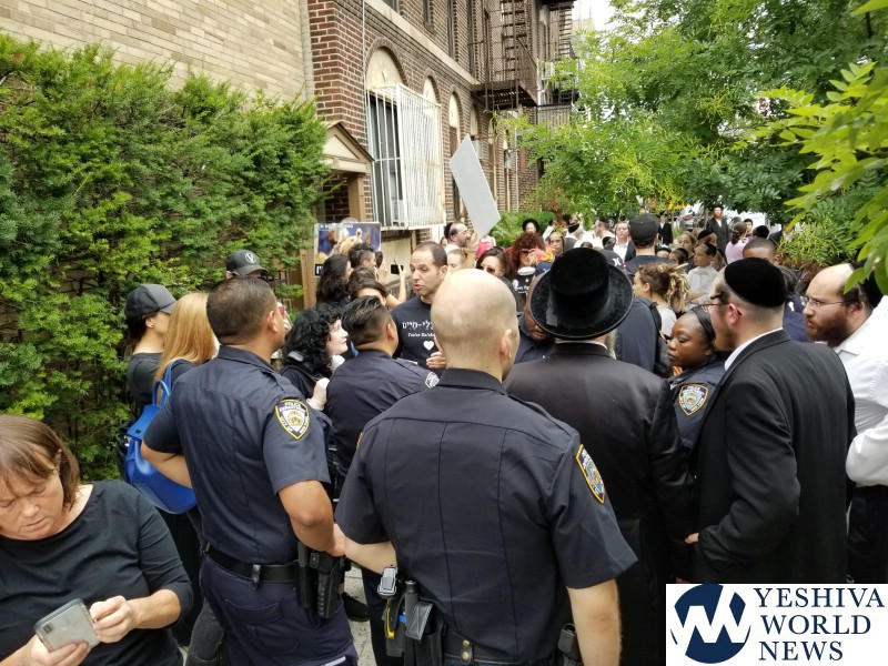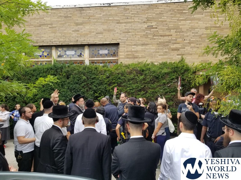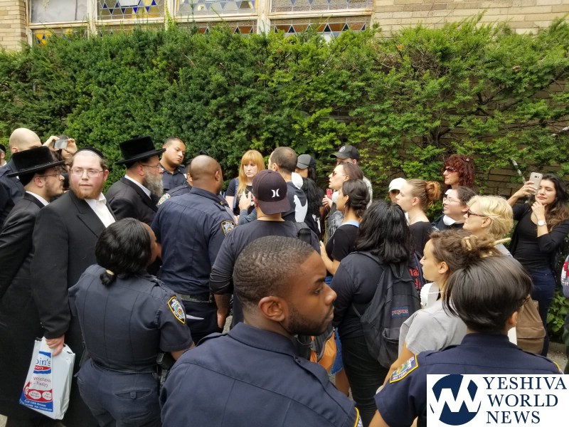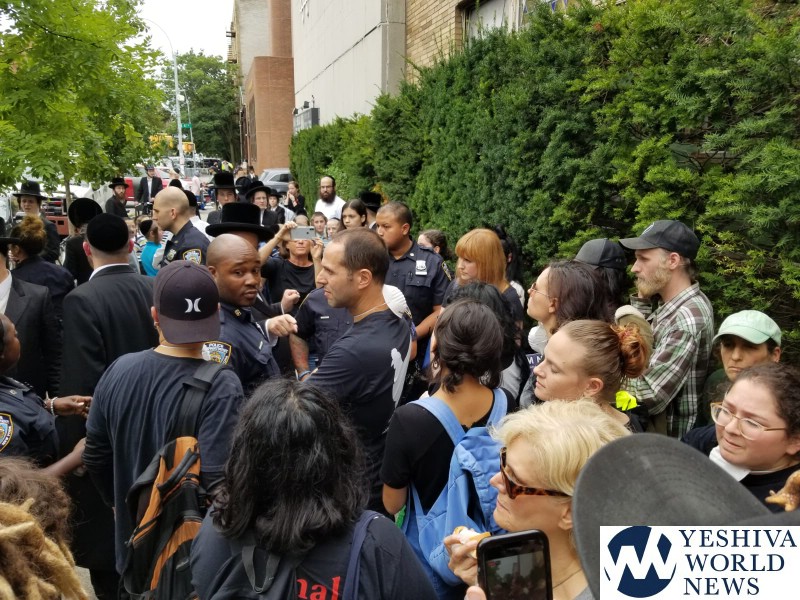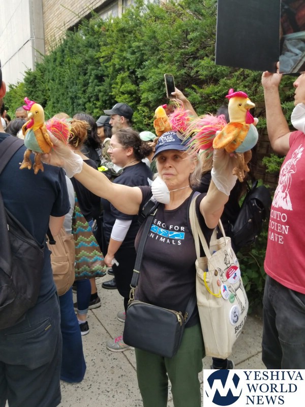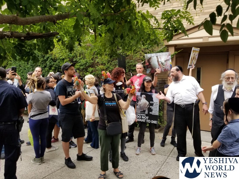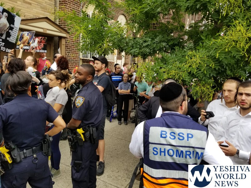 On Friday afternoon, a group of people wearing “Tzar Ba’alei Chaim” tee-shirts protested at the Skver Boro Park Kapparos Center on 14 Avenue and 45th Street. The NYPD and Shomrim were called, after the group got violent and broke a fence. No arrests were made.
