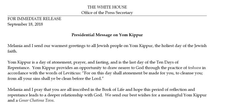 Melania and I send our warmest greetings to all Jewish people on Yom Kippur, the holiest day of the Jewish faith.