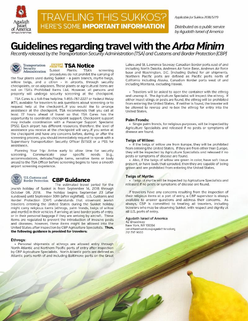 Both the Transportation Security Administration (TSA) and U.S. Customs and Border Protection (CBP) have notified their respective field personnel about the upcoming Sukkos holiday and the increased level of travel by persons of the Jewish faith, many of whom will be carrying arba minim.