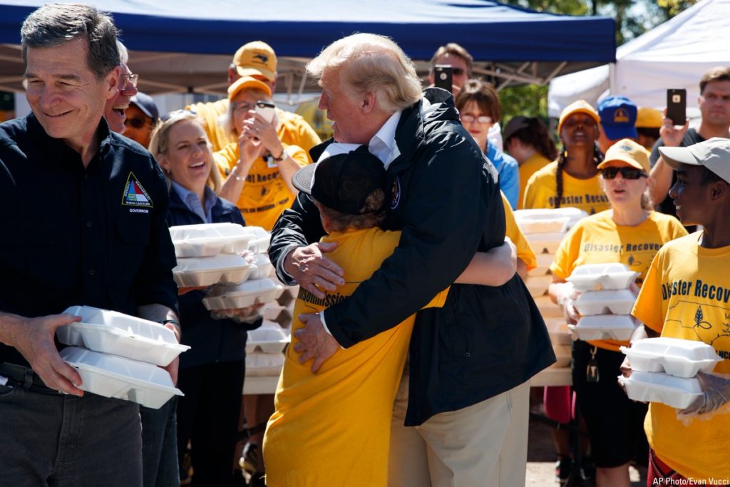 During a packed day, a wind-breaker-clad Trump visited both North and South Carolina, distributed meals at a church, walked amid piles of sodden furniture in damaged neighborhoods, offered hugs and handshakes to residents and discussed the response efforts with local and state officials.