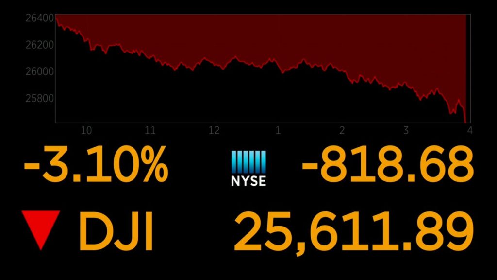 The Dow Jones Industrial Average gave up 831.83 points, or 3.1 percent, to 25,598.74. The Russell 2000 index of smaller-company stocks shed 46.45 points, or 2.9 percent, to 1,575.41.