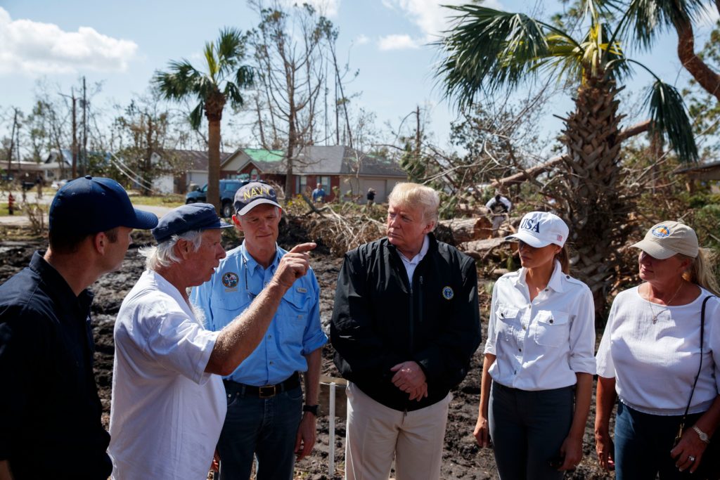 Before visiting the city of Lynn Haven, Trump took a 55-minute helicopter tour of the region to see how the local and state rescue efforts were progressing. He saw houses stripped of their roofs, a water tower that had toppled to the ground and 18-wheel trucks scattered in a parking lot.