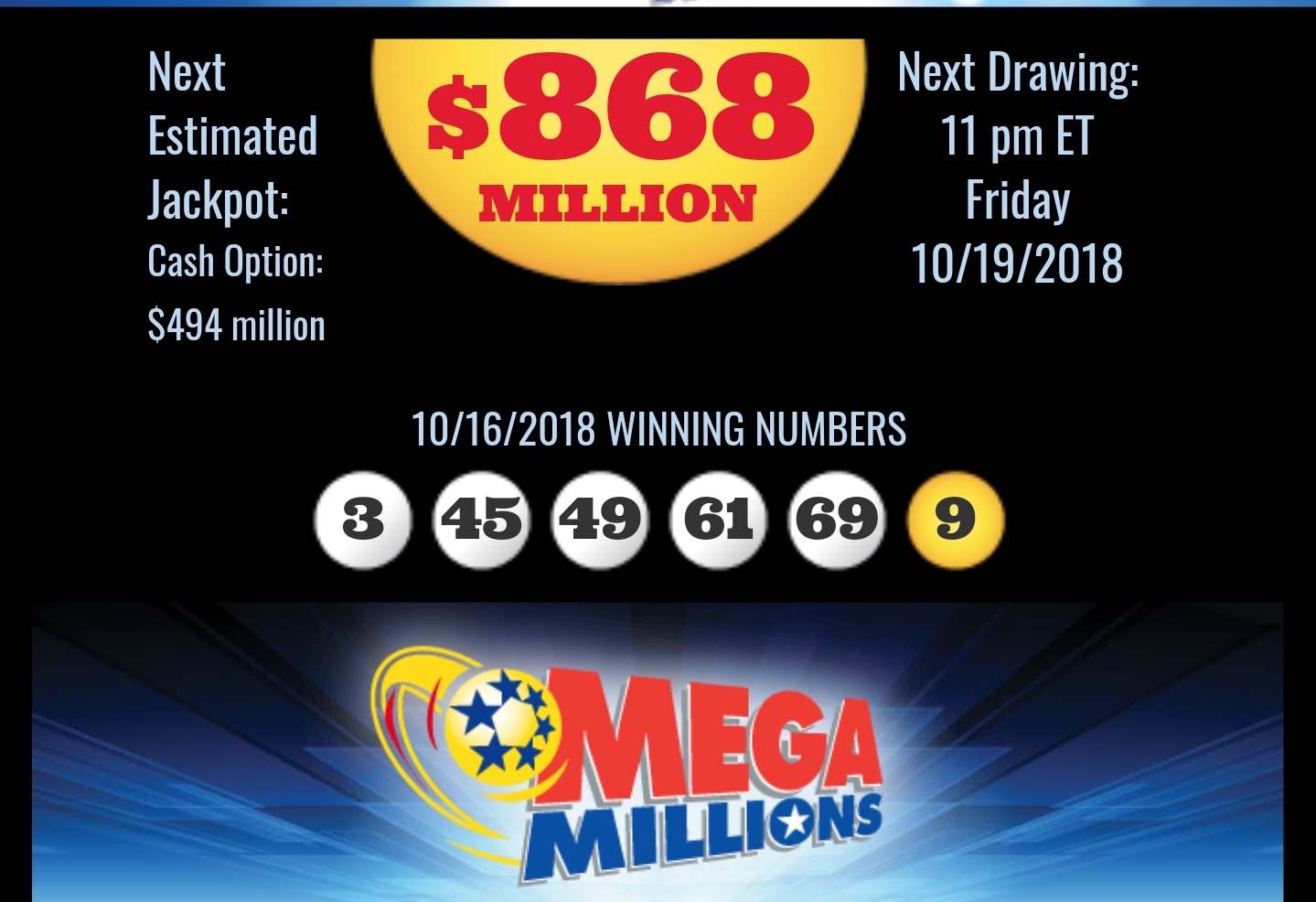 The $868 million jackpot refers to the annuity option, paid out over 29 years. The cash option, which is favored by nearly all winners, is $494 million.