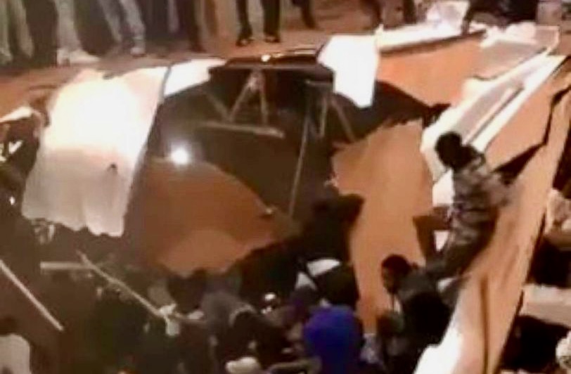 Video posted on social media shows a large part of the first floor falling as people danced, causing many of them to tumble to the floor below.