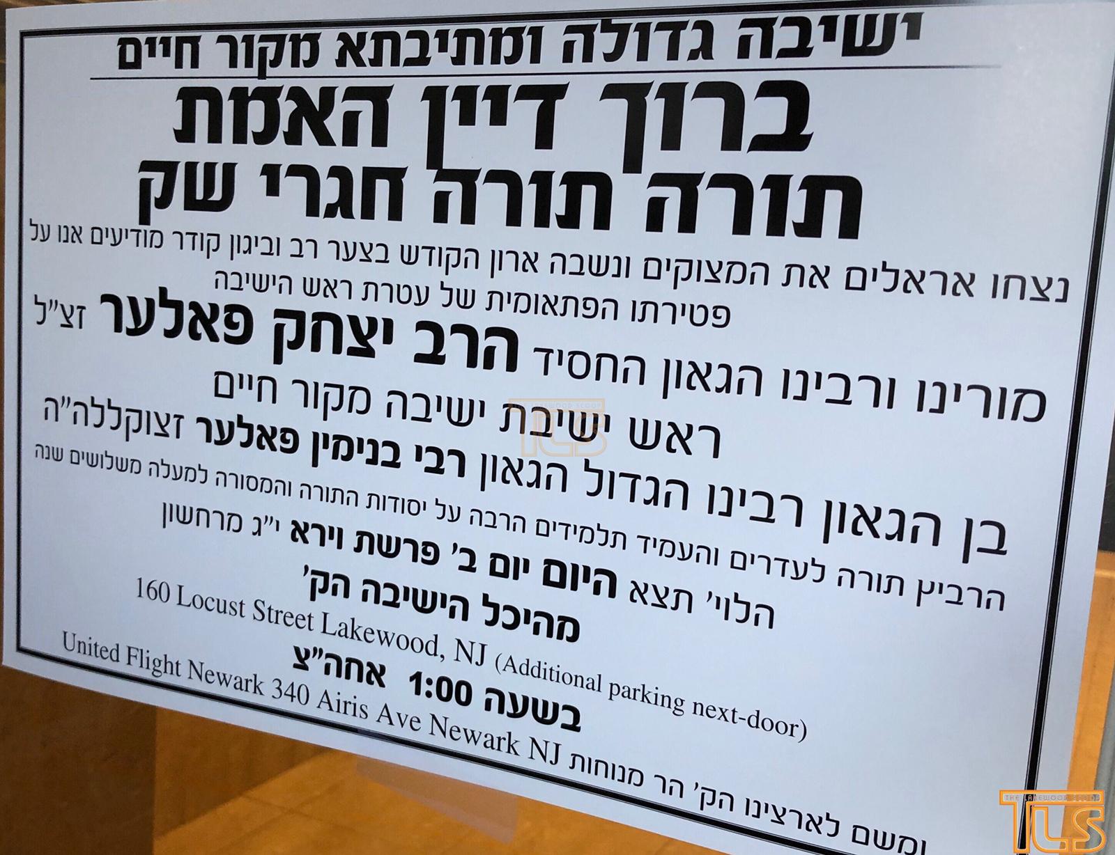 The Levayah is scheduled for 1:00PM at Yeshiva Mekor Chaim, 160 Locust Street in Lakewood. Kevurah will be in Eretz Yisroel.