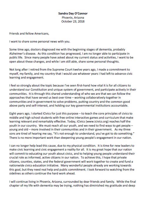 She was 75 when she announced her retirement from the court in 2005. It was a decision influenced by the decline in the health of her husband, John O’Connor III, who had been diagnosed with Alzheimer’s disease.