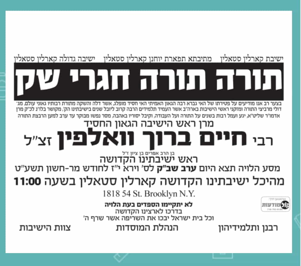 Rav Wolpin served as the Rosh Yeshiva of Stoliner Yeshiva in Boro Park for more than 40 years.