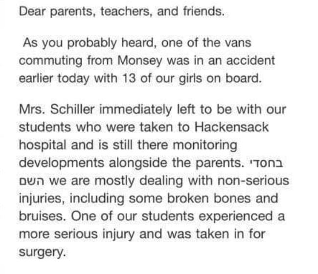 Parents should be aware Children should be transported to school with school buses. Which are fully insured. Transporting from ny to nj requires to be apprived by (fmcsa)federal motor carrier safety administration and needs to be 5 million insurance and drivers need to be state certified which is 19 a qualified. Buses need to be DOT inspected twice a year. And when using buses make sure they have insurance for hire and not from private yeshivos who give you cheap pricing and are not for hire. That when chas vasholom something like this happens there is no insurance coverage!